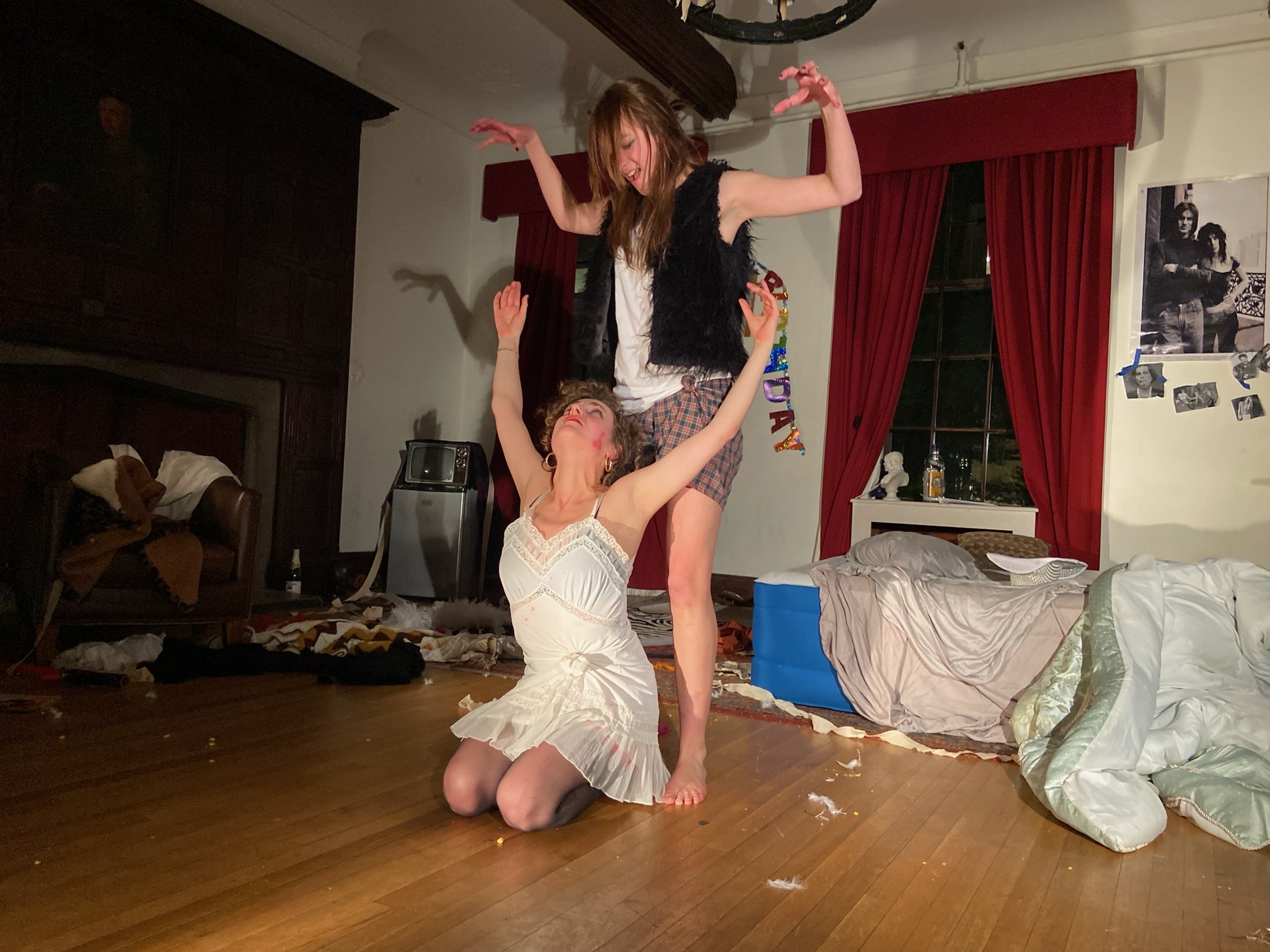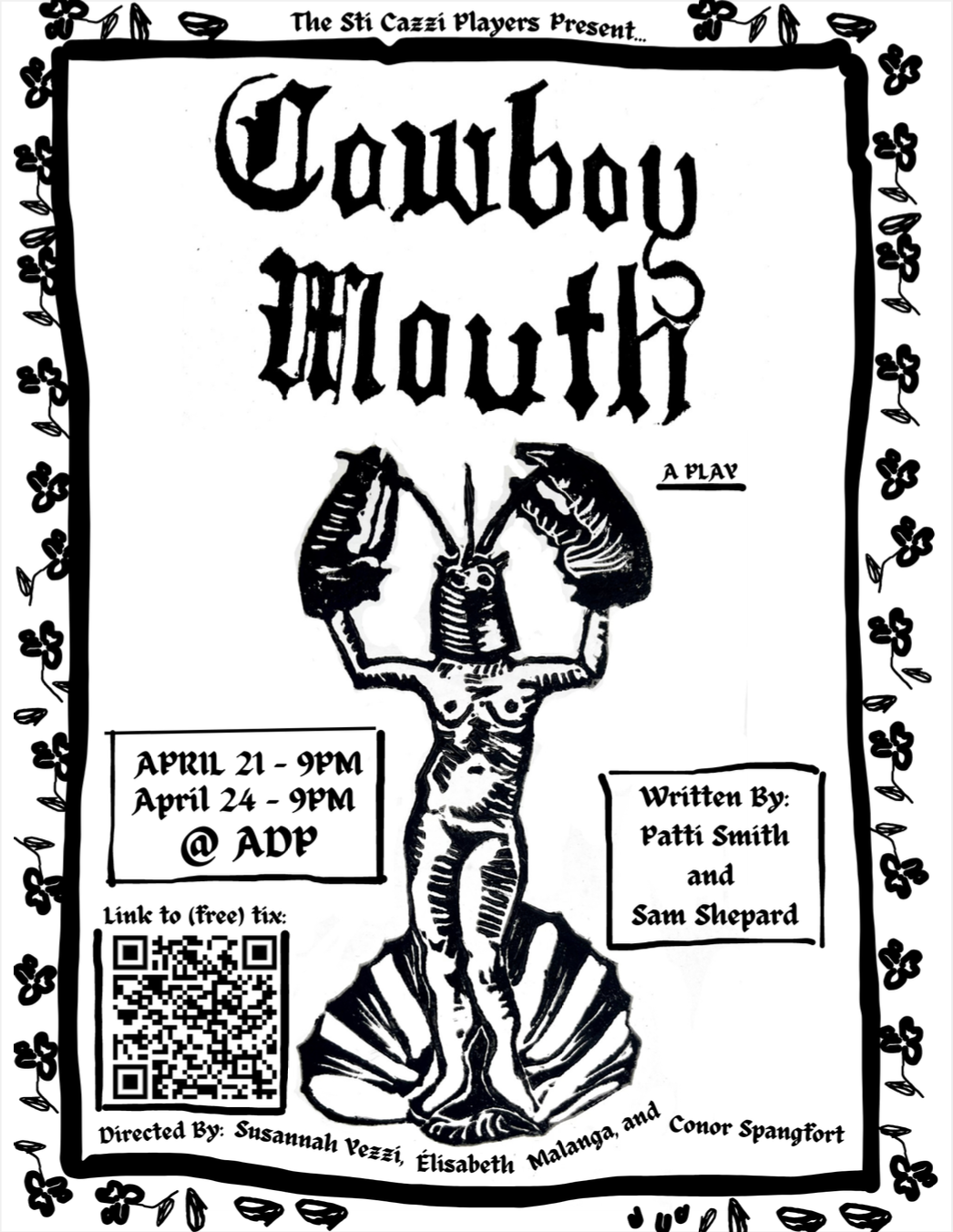 Sti Cazzi’s first production. Starring and directed by Élisabeth Malanga (Cavale), Susannah Yezzi (Slim), and Conor Spangfort (Lobster Man). A queer reimagining of Patti Smith and Sam Shepard’s Cowboy Mouth. Staged in a frat-house living room. Complete with a live jazz band, papier-mâché lobster head, and ballet.
