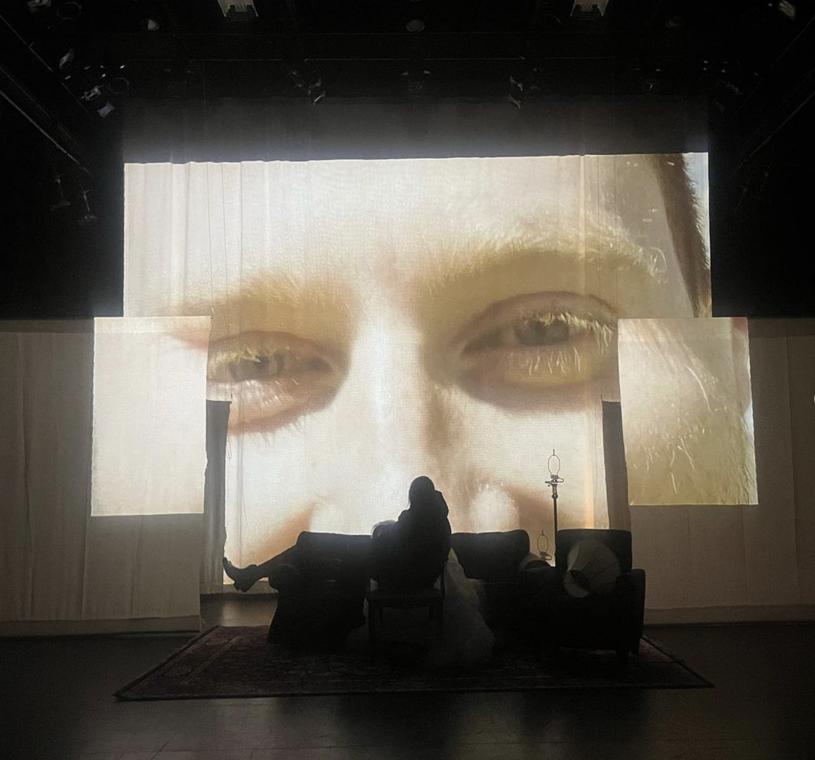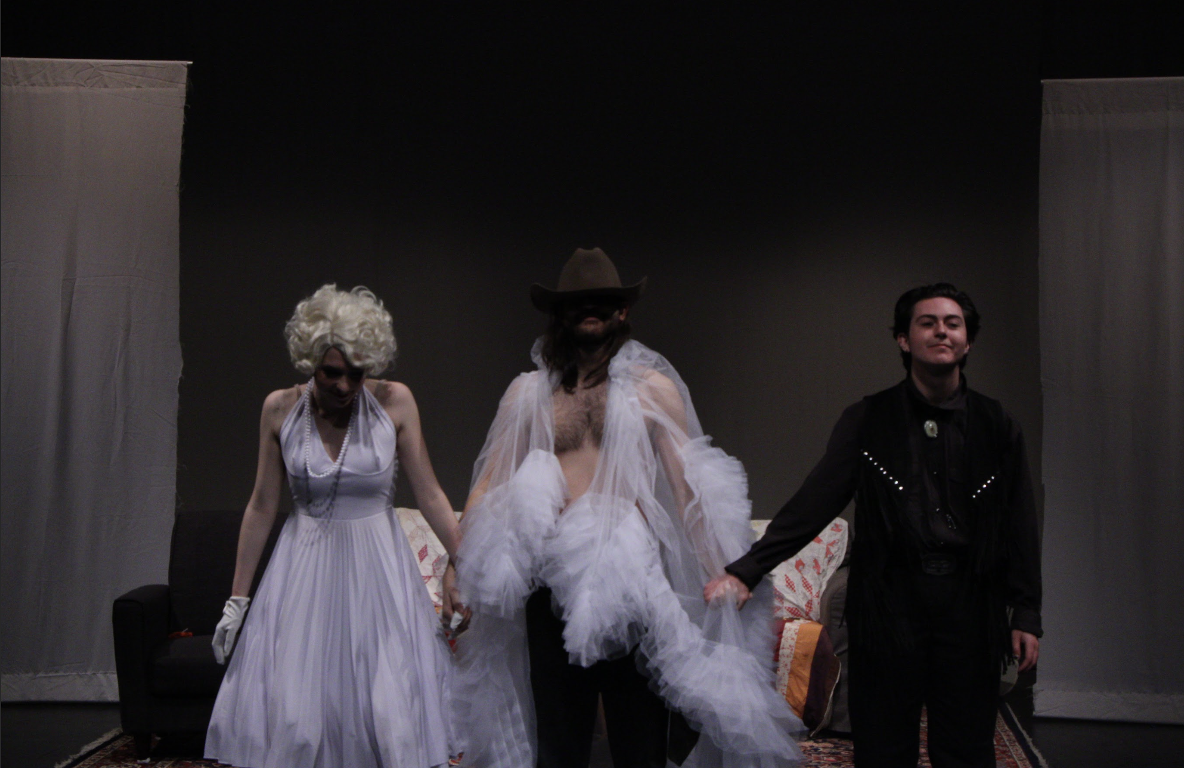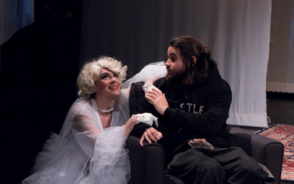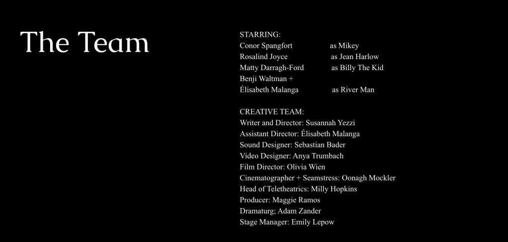 Sti Cazzi’s latest play, performed at the Glicker Milstein Theater in April of 2024. Loosely inspired by Michael McClure’s The Beard, GRAAHR! is an original play written and directed by Susannah Yezzi, exploring themes of sex, memory, iconography, and loneliness in the computer age. Starring Conor Spangfort (Mikey), Rosalind Joyce (Jean Harlow), and Matty Darragh-Ford (Billy the Kid), Graaahr! featured heavy projections and teletheatrics filmed by Olivia Wien, Oonagh Mockler, and Milly Hopkins.